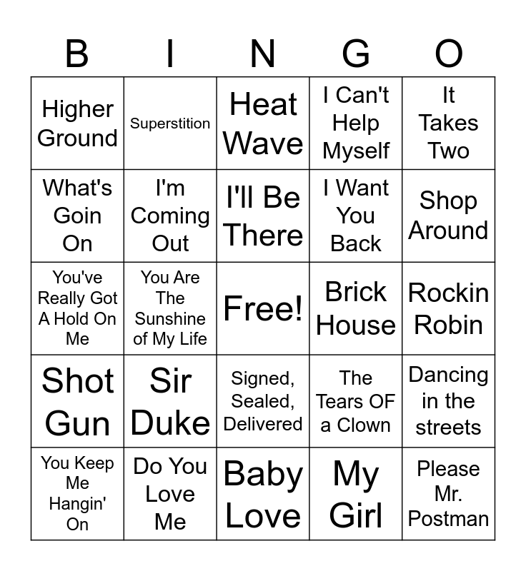 This bingo card has a free space and 32 words: My Girl, My Guy, You Are The Sunshine of My Life, ABC, Shot Gun, I'm Coming Out, It Takes Two, Dancing in the streets, Superstition, You Can't Hurry Love, I'll Be There, Heat Wave, Money, War, Brick House, Stop! In The Name of Love, You Keep Me Hangin' On, You've Really Got A Hold On Me, Signed, Sealed, Delivered, Sir Duke, The Tears OF a Clown, Reach Out, I'll Be There, Rockin Robin, Do You Love Me, Please Mr. Postman, I Can't Help Myself, I Want You Back, What's Goin On, Higher Ground, Baby Love, Ain't No Mountain and Shop Around.
