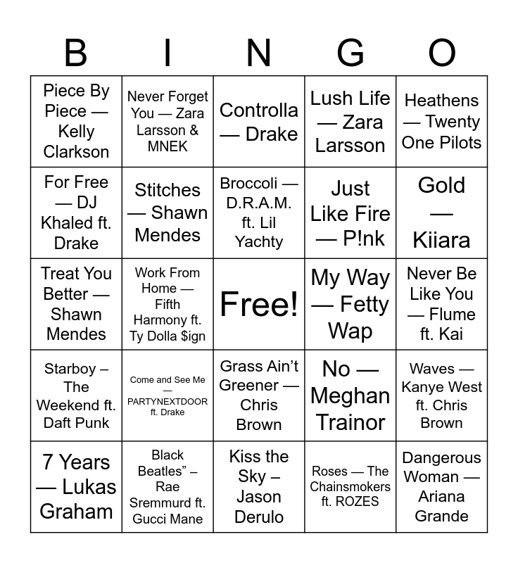 This bingo card has a free space and 75 words: One Dance — Drake ft. WizKid & Kyla, Too Good — Drake ft. Rihanna, Controlla — Drake, Work — Rihanna ft. Drake, Needed Me — Rihanna, This Is What You Came For — Calvin Harris ft. Rihanna, Cheap Thrills — Sia ft. Sean Paul, Don’t Let Me Down — The Chainsmokers ft. Daya, Closer — The Chainsmokers ft. Halsey, I Took A Pill In Ibiza (Seeb Remix) — Mike Posner, Can’t Stop The Feeling! — Justin Timberlake, Panda — Desiigner, Broccoli — D.R.A.M. ft. Lil Yachty, For Free — DJ Khaled ft. Drake, All the Way Up — Fat Joe & Remy Ma ft. French Montana, Work From Home — Fifth Harmony ft. Ty Dolla $ign, Into You — Ariana Grande, Dangerous Woman — Ariana Grande, Ride — Twenty One Pilots, Heathens — Twenty One Pilots, Cake By The Ocean — DNCE, Treat You Better — Shawn Mendes, Stitches — Shawn Mendes, Never Forget You — Zara Larsson & MNEK, Lush Life — Zara Larsson, Cold Water — Major Lazer ft. Justin Bieber & MØ, Let Me Love You — DJ Snake ft. Justin Bieber, Middle — DJ Snake ft. Bipolar Sunshine, Don’t Mind — Kent Jones, Hands To Myself — Selena Gomez, Kill Em With Kindness — Selena Gomez, We Don’t Talk Anymore — Charlie Puth ft. Selena Gomez, Me Too — Meghan Trainor, No — Meghan Trainor, Gold — Kiiara, Just Like Fire — P!nk, Sit Still, Look Pretty — Daya, Needed You — DJ Snake ft. George Maple, Never Be Like You — Flume ft. Kai, Roses — The Chainsmokers ft. ROZES, Perfect Strangers — Jonas Blue ft. JP Cooper, This Girl — Kungs vs Cookin’ On 3 Burners, Love Yourself — Justin Bieber, Sorry — Justin Bieber, What Do You Mean? — Justin Bieber, My House — Flo Rida, 7 Years — Lukas Graham, Piece By Piece — Kelly Clarkson, Don’t — Bryson Tiller, Exchange — Bryson Tiller, Back To Sleep — Chris Brown, Grass Ain’t Greener — Chris Brown, Needed You — Marian Hill, Say It — Tory Lanez, Luv — Tory Lanez, Hotline Bling — Drake, Down In The DM — Yo Gotti, Ooouuu — Young M.A, Low Life — Future ft. The Weekend, Wicked — Future, Come and See Me — PARTYNEXTDOOR ft. Drake, Needed You — Travis Scott ft. Nav, Pick Up The Phone — Young Thug, Travis Scott & Quavo, Antidote — Travis Scott, 679 — Fetty Wap ft. Remy Boyz, My Way — Fetty Wap, No Problem — Chance the Rapper ft. Lil Wayne & 2 Chainz, Ultralight Beam — Kanye West, Father Stretch My Hands Pt. 1 — Kanye West, Waves — Kanye West ft. Chris Brown, Starboy – The Weekend ft. Daft Punk, Black Beatles” – Rae Sremmurd ft. Gucci Mane, Bad and Boujee – Migos ft. Lil Uzi Vert, Kiss the Sky – Jason Derulo and Shout Out to My Ex – Little Mix.