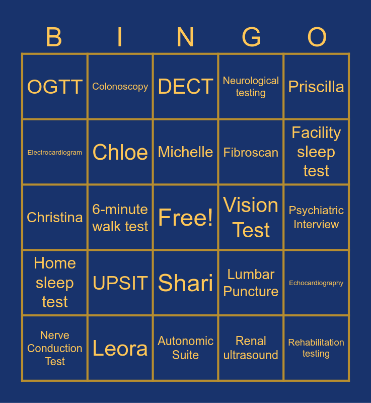 This bingo card has a free space and 40 words: Gabby, Christina, Crystal, Chloe, Leora, Shari, Michelle, Yvette, Priscilla, Home sleep test, 6-minute walk test, Neurological testing, Rehabilitation testing, Psychiatric Interview, Vision Test, UPSIT, NIH Toolbox, OGTT, Volumetric Chest CT, DECT, Echocardiography, Renal ultrasound, Fibroscan, Electrocardiogram, Pulmonary Function Tests, Audiometry, Neurocognitive Tests, EndoPAT, Brain MRI, Cardiac MRI, Gastric Emptying Test, Nerve Conduction Test, Electromyography, Lumbar Puncture, Facility sleep test, Autonomic Suite, Skin biopsy, CPET, Colonoscopy and Upper endoscopy.