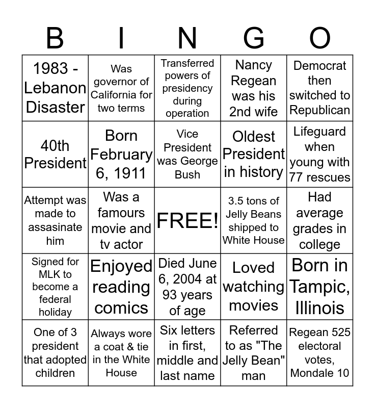 This bingo card has a free space and 24 words: Enjoyed reading comics, Always wore a coat & tie in the White House, Vice President was George Bush, One of 3 president that adopted children, Democrat then switched to Republican, 1983 - Lebanon Disaster, 40th President, Was governor of California for two terms, 3.5 tons of Jelly Beans shipped to White House, Died June 6, 2004 at 93 years of age, Oldest President in history, Attempt was made to assasinate him, Loved watching movies, Born in Tampic, Illinois, Born February 6, 1911, Referred to as "The Jelly Bean" man, Had average grades in college, Transferred powers of presidency during operation, Lifeguard when young with 77 rescues, Was a famours movie and tv actor, Regean 525 electoral votes, Mondale 10, Signed for MLK to become a federal holiday, Nancy Regean was his 2nd wife and Six letters in first, middle and last name.
