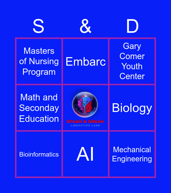 This bingo card has a free space and 49 words: Masters in Nursing, Barton Elementary School, Chemistry, UIC, Illinois Tech, DePaul University, Embarc, Math and Secondary Education, Biology, Cyber Forensics and Security, Bioinformatics, Math and Seconday Education, Astrophysics/Math, Health Administration and Biotechnology, Marketing, Computer Science, AI, Math and Mechanical Engineering, Biological Sciences, Mechanical Engineering, Info Technology, Health Policy and Admin, Masters of Nursing Program, Architectural Engineering, Biology Major on the Pre-Medicine Track, Strategic Educational Leadership - Master of Education, Biochemistry, St. Xavier, IIT, Rush University, Loyola University, Roosevelt University, University of Ilinois Urbana and Rush, Purdue University, UChicago, IIT & Dominican University, Governors State University, National Louis University, University of Illinois at Chicago, Johnson STEAM Elementary School, Chalmers Elementary, Legacy Charter, The Academy Group, Randolph Elementary, Gary Comer Middle School, Gary Comer Youth Center, Perspectives / IIT, Sarah E. Goode H.S and ].