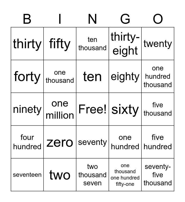 This bingo card has a free space and 24 words: zero, two, ten, seventeen, twenty, thirty, forty, fifty, sixty, seventy, eighty, ninety, one hundred, five hundred, one thousand, one thousand one hundred fifty-one, five thousand, ten thousand, one hundred thousand, one million, seventy-five thousand, four hundred, thirty-eight and two thousand seven.