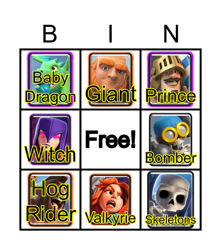 This bingo card has 12 images, a free space and 12 words: Knight, Archers, Skeletons, Bomber, Giant, Prince, Valkyrie, Musketeer, Baby Dragon, Witch, Hog Rider and Goblin Gang.