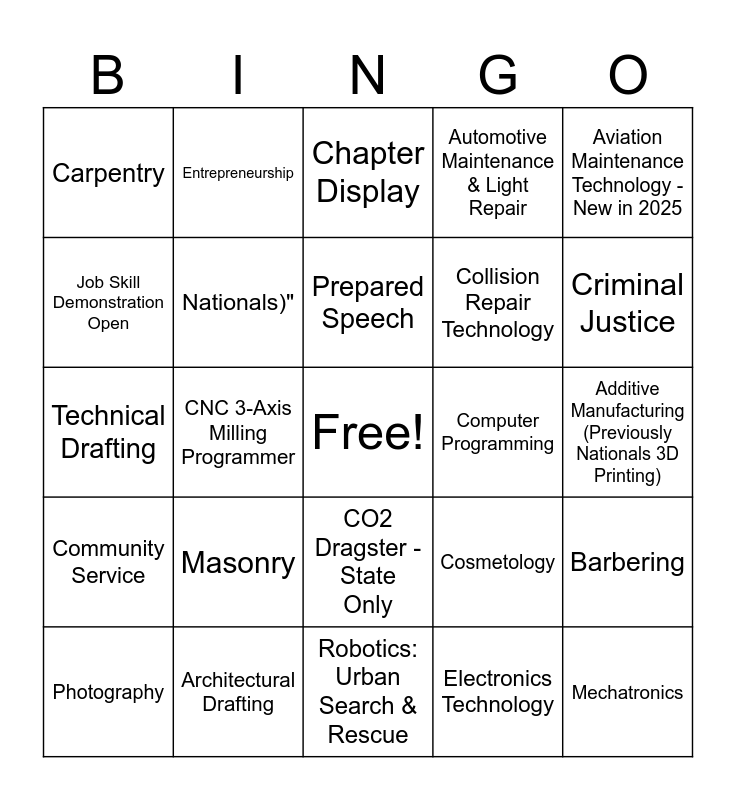 This bingo card has a free space and 69 words: 3D Printing and Design - State Only, Additive Manufacturing (Previously Nationals 3D Printing), Advertising Design, American Spirit, Architectural Drafting, Automated Manufacturing Technology, Automotive Maintenance & Light Repair, Automotive Service Technology, Aviation Maintenance Technology - New in 2025, Baking and Pastry Arts - New in 2025, Barbering, Cabinetmaking, Carpentry, Chapter Display, CNC 2-Axis Turning Programmer, CNC 3-Axis Milling Programmer, CO2 Dragster - State Only, Collision Repair Technology, Commercial sUAS Drone, Community Service, Computer Programming, Cosmetology, Criminal Justice, Culinary Arts, Customer Service, Diesel Equipment Technology, Digital Cinema Production, Electrical Construction Wiring, Electronics Technology, Engineering Technology/Design - MS New in 2025, Entrepreneurship, Extemporaneous Speaking, Facilithon, First Aid/CPR, Industrial Robotics - State Only, Information Technology Services, Job Interview, Job Skill Demonstration A, Job Skill Demonstration Open, Marine Service Technology, Masonry, Mechatronics, Medical Math, Medical Terminology, Opening & Closing Ceremonies, Photography, Pin Design, Power Equipment Technology, "Precision Machining Technology (CNC Technician at, Nationals)", Prepared Speech, Promotional Bulletin Board, Related Technical Math - HS only Nationals, Robotics: Urban Search & Rescue, Screen Printing Technology, Sheet Metal, T-Shirt Design, Team Engineering Challenge - MS only Nationals, TeamWorks, Technical Drafting, Video Production (formerly Television Video Production), Video News Production (formerly Broadcast News), Welding, Welding Fabrication, Welding Sculpture, Woodworking Display (Cost $0-$50) State Only, Woodworking Display (Cost $0-$100) MS Only -State Only, Woodworking Display (Cost $51-$149) State Only and Woodworking Display (Cost $150-$400) State Only.