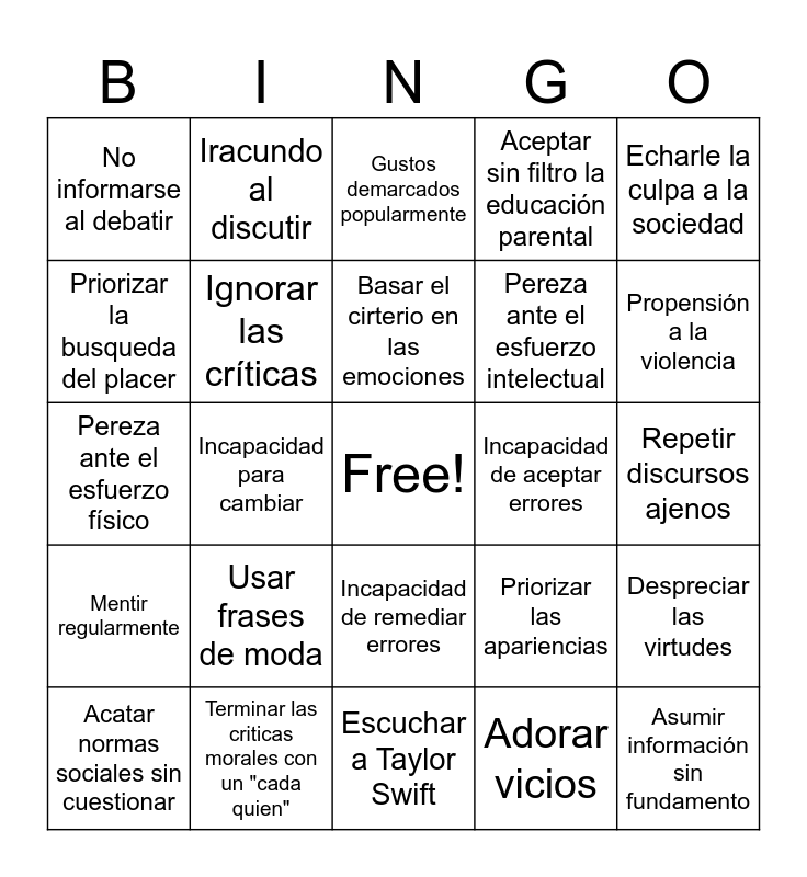 This bingo card has a free space and 24 words: Usar frases de moda, Terminar las criticas morales con un "cada quien", Basar el cirterio en las emociones, Acatar normas sociales sin cuestionar, Echarle la culpa a la sociedad, No informarse al debatir, Priorizar la busqueda del placer, Iracundo al discutir, Incapacidad de aceptar errores, Incapacidad de remediar errores, Pereza ante el esfuerzo intelectual, Pereza ante el esfuerzo físico, Priorizar las apariencias, Despreciar las virtudes, Ignorar las críticas, Adorar vicios, Repetir discursos ajenos, Gustos demarcados popularmente, Propensión a la violencia, Incapacidad para cambiar, Asumir información sin fundamento, Mentir regularmente, Aceptar sin filtro la educación parental and Escuchar a Taylor Swift.