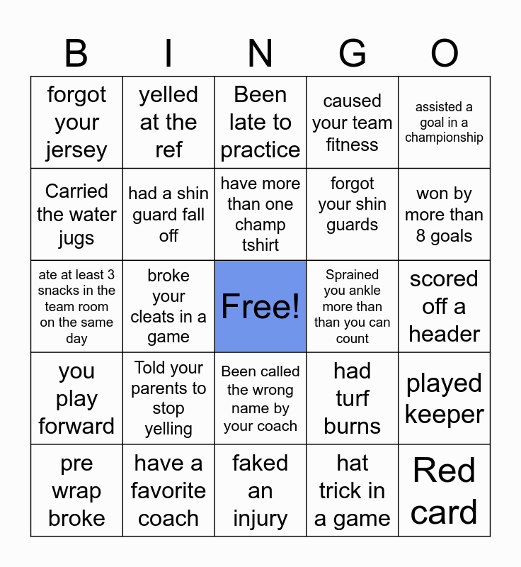 This bingo card has a free space and 24 words: pre wrap broke, Told your parents to stop yelling, have more than one champ tshirt, hat trick in a game, assisted a goal in a championship, forgot your jersey, yelled at the ref, Been late to practice, Sprained you ankle more than than you can count, scored off a header, ate at least 3 snacks in the team room on the same day, had a shin guard fall off, had turf burns, played keeper, Carried the water jugs, have a favorite coach, faked an injury, caused your team fitness, won by more than 8 goals, you play forward, broke your cleats in a game, Been called the wrong name by your coach, forgot your shin guards and Red card.