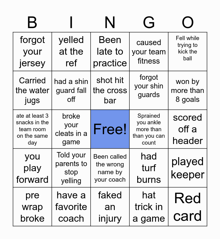 This bingo card has a free space and 24 words: pre wrap broke, Told your parents to stop yelling, shot hit the cross bar, hat trick in a game, Fell while trying to kick the ball, forgot your jersey, yelled at the ref, Been late to practice, Sprained you ankle more than than you can count, scored off a header, ate at least 3 snacks in the team room on the same day, had a shin guard fall off, had turf burns, played keeper, Carried the water jugs, have a favorite coach, faked an injury, caused your team fitness, won by more than 8 goals, you play forward, broke your cleats in a game, Been called the wrong name by your coach, forgot your shin guards and Red card.