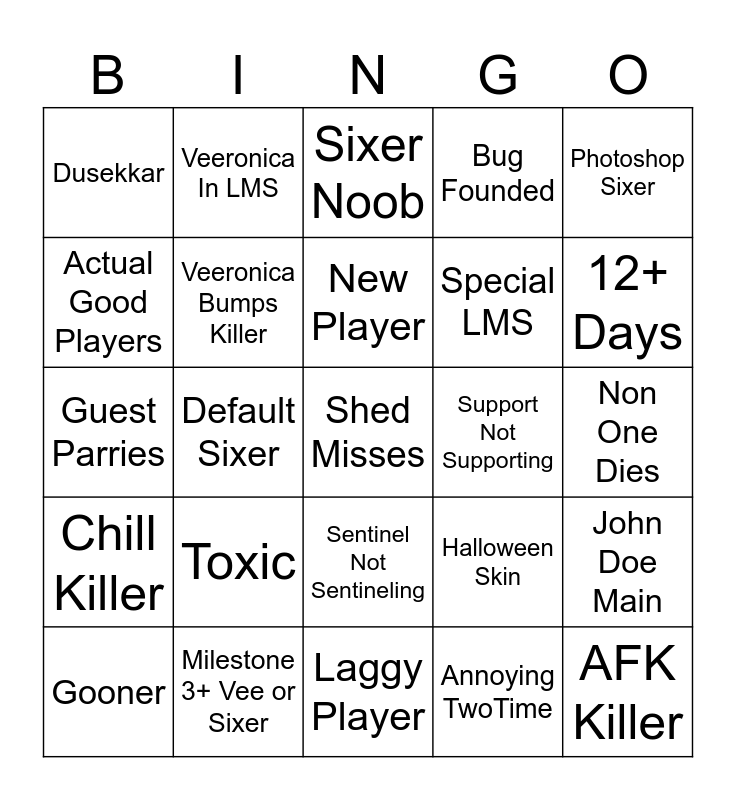 This bingo card has a free space and 24 words: Toxic, Milestone 3+ Vee or Sixer, New Player, Gooner, Photoshop Sixer, Dusekkar, Actual Good Players, Veeronica In LMS, Support Not Supporting, Sentinel Not Sentineling, Special LMS, Guest Parries, Halloween Skin, John Doe Main, Veeronica Bumps Killer, Annoying TwoTime, Non One Dies, Sixer Noob, 12+ Days, Default Sixer, AFK Killer, Chill Killer, Bug Founded and Laggy Player.