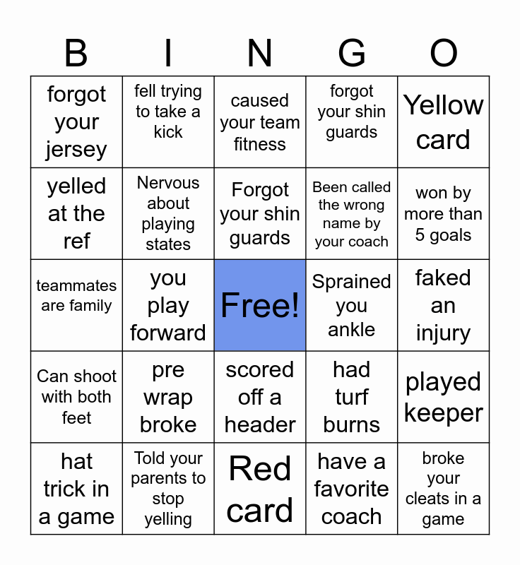 This bingo card has a free space and 24 words: pre wrap broke, Told your parents to stop yelling, Forgot your shin guards, hat trick in a game, Yellow card, forgot your jersey, yelled at the ref, fell trying to take a kick, Sprained you ankle, scored off a header, Been called the wrong name by your coach, teammates are family, had turf burns, played keeper, Nervous about playing states, have a favorite coach, faked an injury, caused your team fitness, won by more than 5 goals, you play forward, broke your cleats in a game, Can shoot with both feet, forgot your shin guards and Red card.