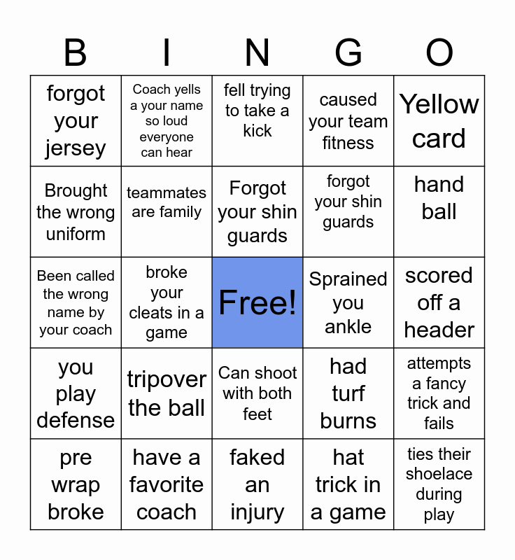 This bingo card has a free space and 24 words: pre wrap broke, tripover the ball, Forgot your shin guards, hat trick in a game, Yellow card, forgot your jersey, Coach yells a your name so loud everyone can hear, fell trying to take a kick, Sprained you ankle, scored off a header, Been called the wrong name by your coach, teammates are family, had turf burns, attempts a fancy trick and fails, Brought the wrong uniform, have a favorite coach, faked an injury, caused your team fitness, hand ball, you play defense, broke your cleats in a game, Can shoot with both feet, forgot your shin guards and ties their shoelace during play.