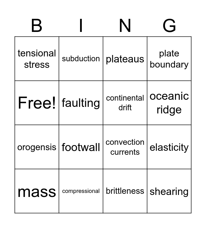 This bingo card has 16 words: compressional, elasticity, plateaus, tensional stress, orogensis, subduction, convection currents, brittleness, Free!, faulting, mass, plate boundary, footwall, oceanic ridge, continental drift and shearing.