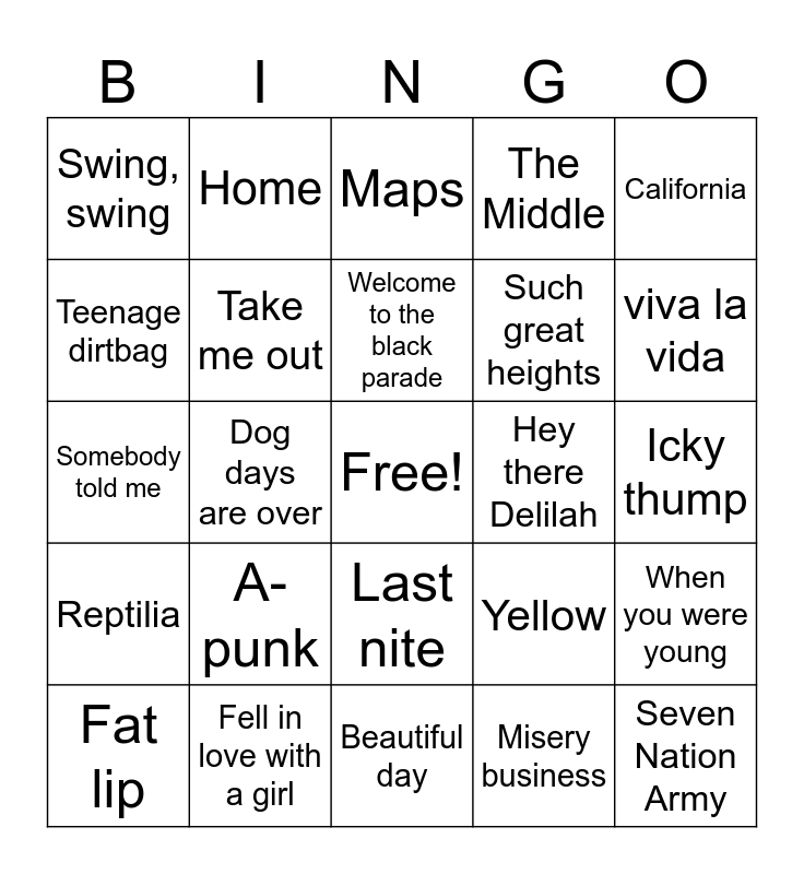 This bingo card has a free space and 46 words: Mr. Brightside, Seven Nation Army, I believe in a thing called love, Beautiful day, A-punk, Pumped up kicks, Home, Young folks, Teenage dirtbag, Electric feel, Take me out, The Middle, When you were young, Yellow, I write sins not tragedies, Stuck in a moment you can't get out of, Welcome to the black parade, Hey there Delilah, Shake it, California, Dog days are over, Misery business, Swing, swing, Such great heights, My paper heart, viva la vida, Fat lip, Are you gonna be my girl, Last nite, Reptilia, Hate to say I told you so, Steady, as she goes, Obstacle 1, How you like me now, Time is running out, Fell in love with a girl, Icky thump, The district sleeps alone tonight, Such great heights, Float on, The yeah yeah yeah song, Maps, Somebody told me, Alright, Tongue tied and Jerk it out.