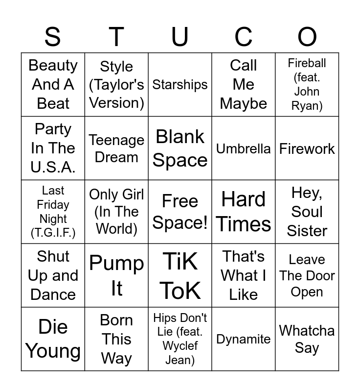 This bingo card has a free space and 50 words: Grenade, Whatcha Say, I Gotta Feeling, Hips Don't Lie (feat. Wyclef Jean), Pump It, Hot N Cold, Style (Taylor's Version), The One That Got Away, Party In The U.S.A., 22 (Taylor's Version), Teenage Dream, Call Me Maybe, Leave The Door Open, That's What I Like, Levitating (feat. DaBaby), Uptown Funk (feat. Bruno Mars), Blank Space, Hard Times, Young Dumb & Broke, Fireball (feat. John Ryan), Only Girl (In The World), Dynamite, Beauty And A Beat, Umbrella, I Knew You Were Trouble, The Sweet Escape, Firework, Timber, Starships, TiK ToK, Toxic, ...Baby One More Time, Counting Stars, Oops!...I Did It Again, Born This Way, Circus, Blow, Titanium (feat. Sia), Roar, Hey, Soul Sister, Wrecking Ball, California Gurls, Just the Way You Are, Applause, Die Young, Last Friday Night (T.G.I.F.), DJ Got Us Fallin' In Love (feat. Pitbull), What Makes You Beautiful, Shut Up and Dance and Love Me Like You Do.