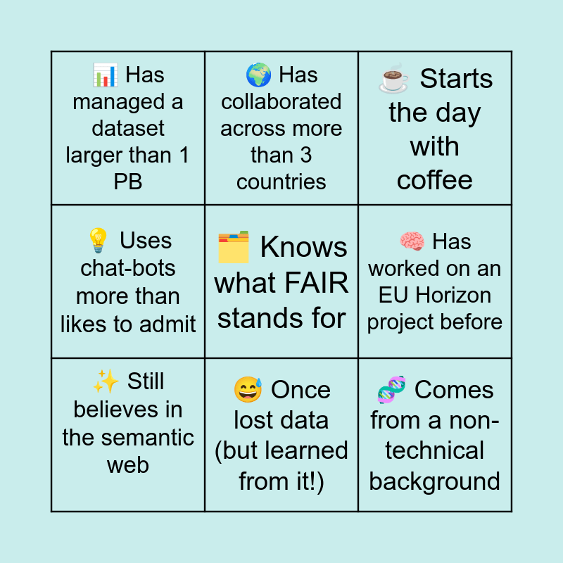 This bingo card has a free space and 8 words: 🧠 Has worked on an EU Horizon project before, ☕ Starts the day with coffee, 🌍 Has collaborated across more than 3 countries, ✨ Still believes in the semantic web, 📊 Has managed a dataset larger than 1 PB, 🧬 Comes from a non-technical background, 💡 Uses chat-bots more than likes to admit and 😅 Once lost data (but learned from it!).