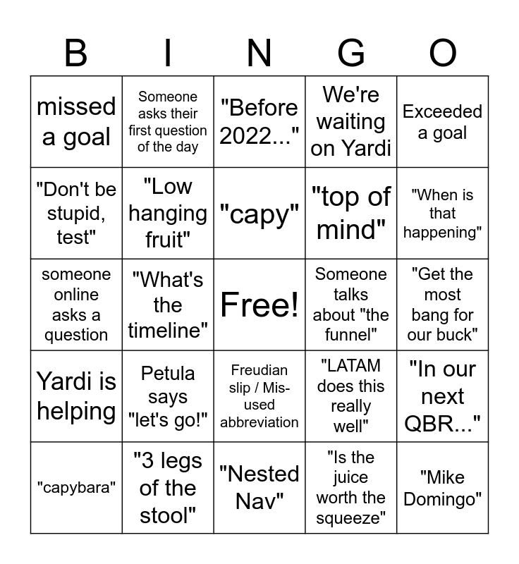 This bingo card has a free space and 24 words: Petula says "let's go!", "3 legs of the stool", "capy", "capybara", Exceeded a goal, missed a goal, "Don't be stupid, test", Someone asks their first question of the day, Someone talks about "the funnel", Freudian slip / Mis-used abbreviation, "top of mind", someone online asks a question, "LATAM does this really well", "In our next QBR...", "Low hanging fruit", "Is the juice worth the squeeze", "Get the most bang for our buck", "Before 2022...", "When is that happening", "What's the timeline", "Mike Domingo", Yardi is helping, We're waiting on Yardi and "Nested Nav".