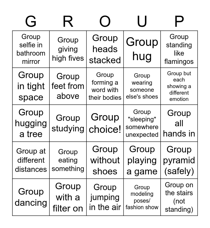 This bingo card has a free space and 25 words: Group eating something, Group jumping in the air, Group forming a word with their bodies, Group dancing, Group standing like flamingos, Group selfie in bathroom mirror, Group in tight space, Group giving high fives, Group "sleeping" somewhere unexpected, Group without shoes, Group wearing someone else's shoes, Group hugging a tree, Group playing a game, Group pyramid (safely), Group feet from above, Group faces from above, Group all hands in, Group heads stacked, Group but each showing a different emotion, Group studying, Group on the stairs (not standing), Group with a filter on, Group at different distances, Group hug and Group modeling poses/ fashion show.