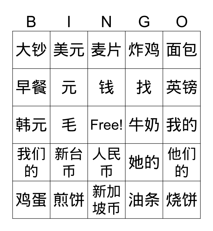 This bingo card has a free space and 45 words: 馒头, 烧饼, 馄饨, 鸡蛋, 包子, 油条, 麦片, 豆浆, 面包, 煎饼, 炸鸡, 牛奶, 人民币, 新台币, 港币, 新加坡币, 日元, 韩元, 欧元, 英镑, 美元, 钞票, 硬币, 大钞, 零钱, 我的, 你的, 他的, 她的, 我们的, 你们的, 他们的, 她们的, 一共, 块, 毛, 分, 件, 事, 钱, 早餐, 找, 找钱, 元 and 角.