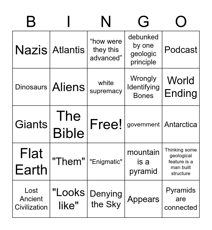 This bingo card has a free space and 24 words: "Them", "Looks like", white supremacy, Lost Ancient Civilization, Podcast, Nazis, Dinosaurs, Atlantis, government, "Enigmatic", Wrongly Identifying Bones, Giants, mountain is a pyramid, Thinking some geological feature is a man built structure, Aliens, Appears, Antarctica, “how were they this advanced”, World Ending, The Bible, Pyramids are connected, Flat Earth, debunked by one geologic principle and Denying the Sky.