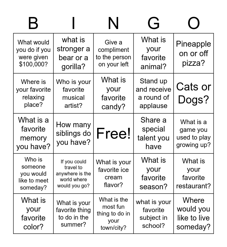 This bingo card has a free space and 24 words: What is your favorite color?, If you could travel to anywhere is the world where would you go?, What is your favorite candy?, what is your favorite subject in school?, Pineapple on or off pizza?, What would you do if you were given $100,000?, what is stronger a bear or a gorilla?, Give a compliment to the person on your left, Share a special talent you have, What is a game you used to play growing up?, What is a favorite memory you have?, Who is your favorite musical artist?, What is your favorite season?, What is your favorite restaurant?, Where is your favorite relaxing place?, What is your favorite thing to do in the summer?, What is the most fun thing to do in your town/city?, What is your favorite animal?, Cats or Dogs?, Who is someone you would like to meet someday?, How many siblings do you have?, What is your favorite ice cream flavor?, Stand up and receive a round of applause and Where would you like to live someday?.