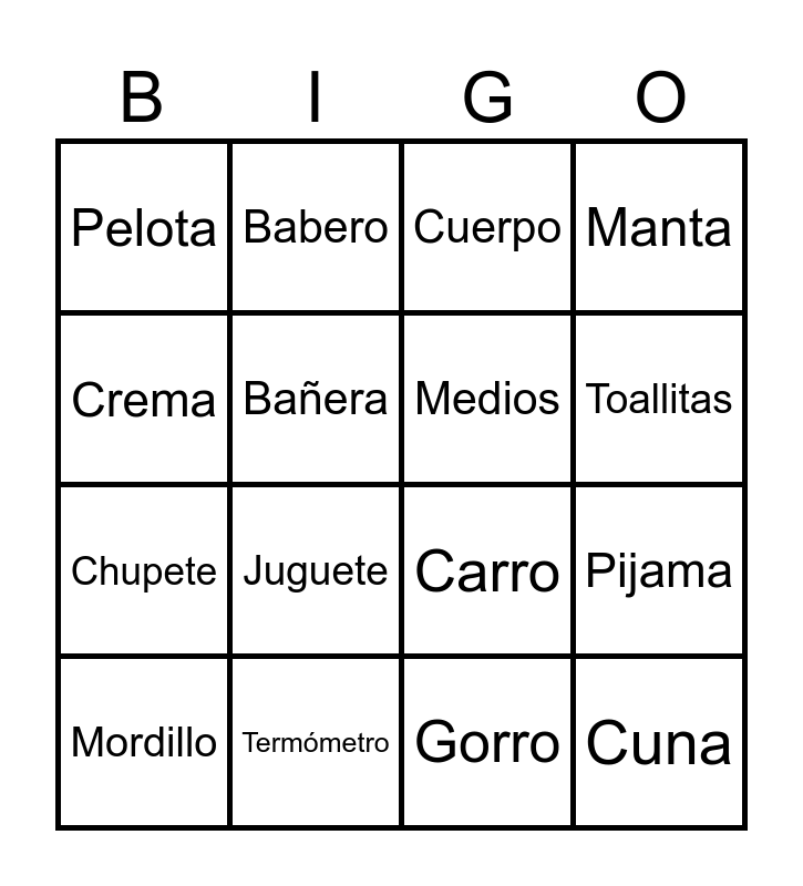 This bingo card has 27 words: Free!, Mamadera, Chupete, Pañal, Bañera, Cuerpo, Babero, Cuna, Termómetro, Bebé, Carro, Manta, Leche, Pañalera, Juguete, Perfume, Medios, Toallitas, Andador, Pelota, Gorro, Auto, Pijama, Mordillo, Cambiador, Crema and Osito.