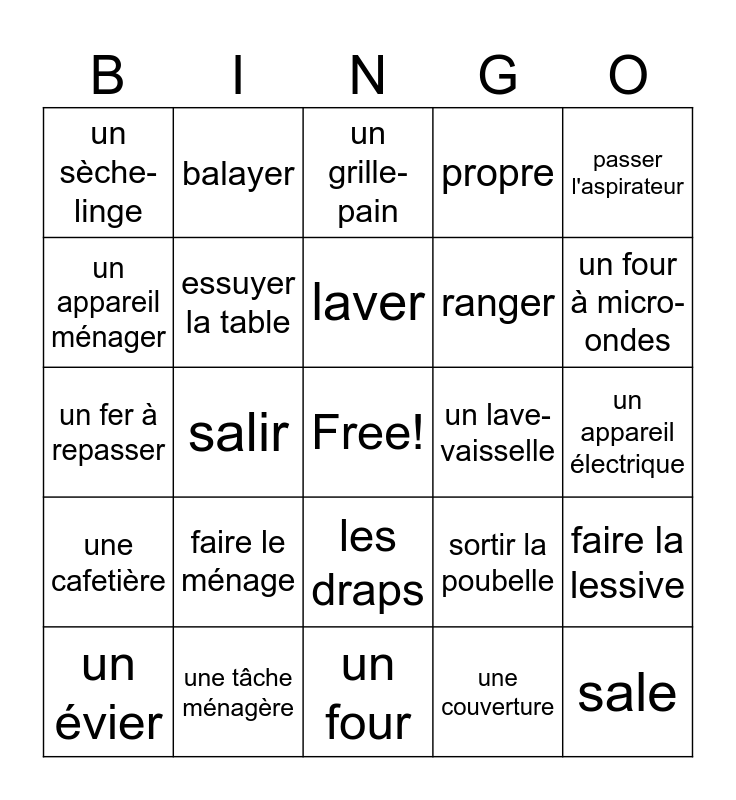 This bingo card has a free space and 38 words: débarrasser la table, enlever/faire la poussière, essuyer la vaisselle, essuyer la table, faire la lessive, faire le ménage, laver, mettre la table, passer l'aspirateur, ranger, salir, propre, sale, un appareil électrique, un appareil ménager, une cafetière, une cuisinière, un grille-pain, un lave-linge, un lave-vaisselle, un sèche-linge, une tâche ménagère, un four à micro-ondes, un évier, faire la vaisselle, un four, un congélateur, un frigo, un balai, faire le lit, un oreiller, les draps, une couverture, balayer, le linge, sortir la poubelle, un fer à repasser and repasser.