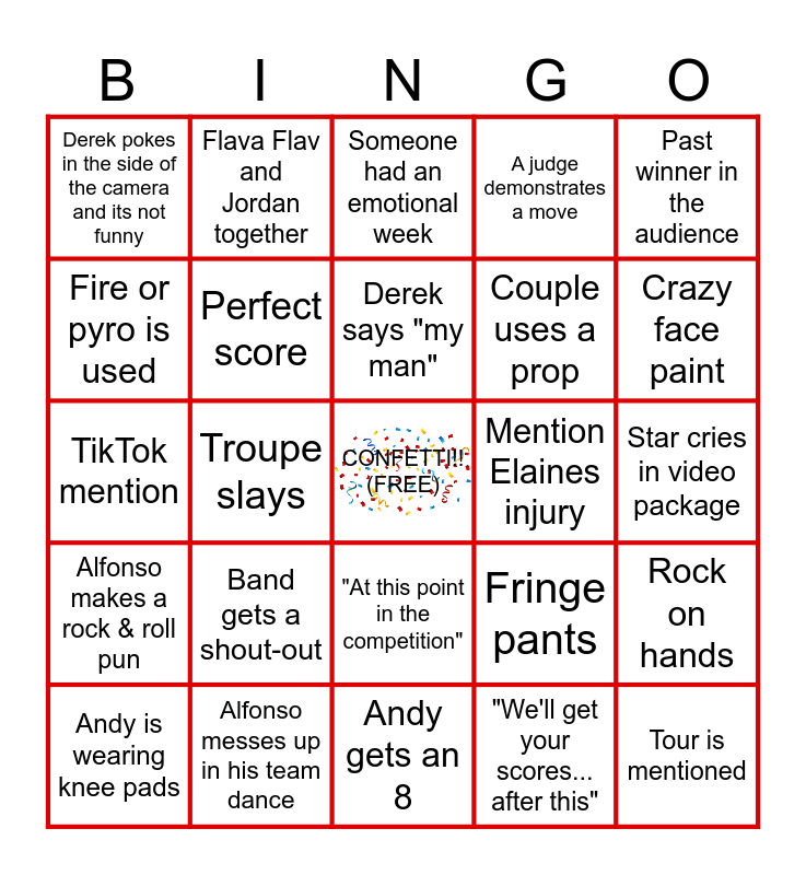 This bingo card has a free space and 34 words: Bruno stand during critiques, "We'll get your scores... after this", They mention Alix and Bon Jovi both being from NJ, Judges get booed, Alfonso makes a rock & roll pun, Perfect score, Past winner in the audience, Andy is wearing knee pads, Flava Flav and Jordan together, Someone cries (on the show, not PJ), Derek says "my man", Someone had an emotional week, "This was your best dance yet!', Team Kool wins, Mention Elaines injury, Crazy face paint, Alfonso messes up in his team dance, TikTok mention, Band gets a shout-out, Fringe pants, "At this point in the competition", Star says they wan to get a 10, Derek pokes in the side of the camera and its not funny, Star cries in video package, Andy gets an 8, Tour is mentioned, A judge demonstrates a move, You can see through Bruno's shirt, Couple uses a prop, Fire or pyro is used, Jordan does a flip, Troupe slays, Rock on hands and Air guitar.