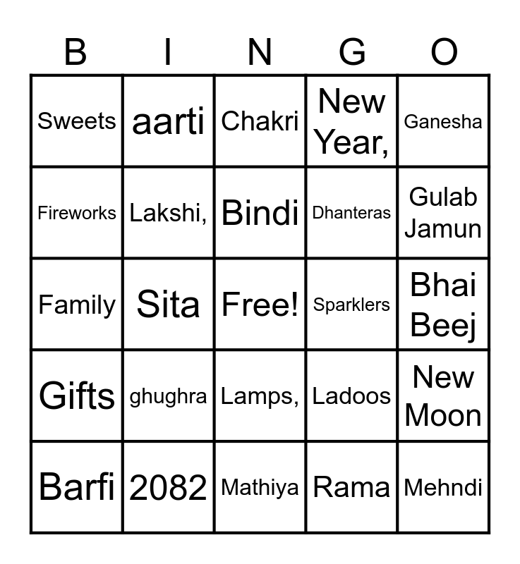 This bingo card has a free space and 35 words: Diwali,, Diya,, Lights,, Lakshi,, Lamps,, New Year,, Fireworks, Rangoli, Bindi, Celebration, Family, Ganesha, Puja, Blessings, Sweets, Sparklers, Rama, Sita, Gifts, Mehndi, Ladoos, Barfi, New Moon, 2082, Chakri, Gulab Jamun, Mithais, Decorations, Dhanteras, Bhai Beej, Fafda, Mathiya, ghughra, aarti and sal mubarak.
