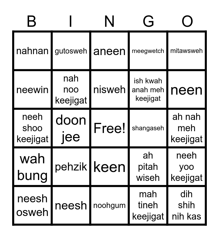 This bingo card has a free space and 24 words: pehzik, neesh, nisweh, neesh osweh, mitawsweh, nahnan, neewin, gutosweh, shangaseh, keen, ish kwah anah meh keejigat, neeh shoo keejigat, ah pitah wiseh, neeh yoo keejigat, nah noo keejigat, mah tineh keejigat, ah nah meh keejigat, aneen, neen, doon jee, dih shih nih kas, wah bung, meegwetch and noohgum.