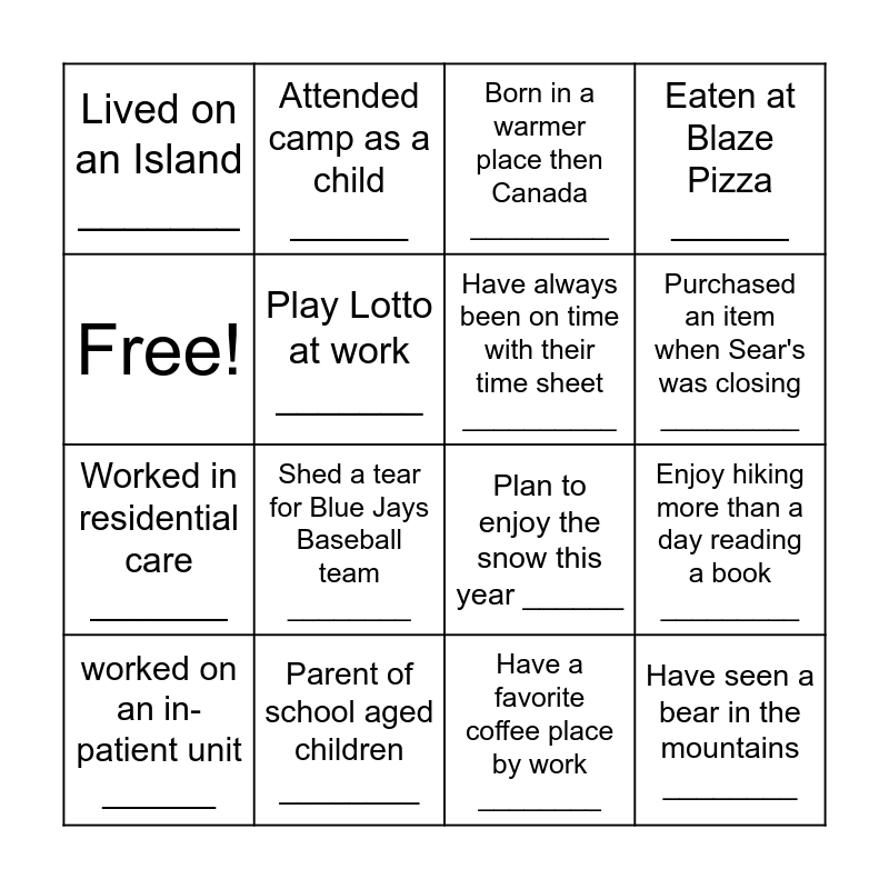 This bingo card has 16 words: Parent of school aged children ________, Enjoy hiking more than a day reading a book _________, Born in a warmer place then Canada _________, Lived on an Island _______, Worked in residential care _______, Attended camp as a child ______, Plan to enjoy the snow this year ______, Have a favorite coffee place by work ________, Free!, Play Lotto at work _______, worked on an in-patient unit ______, Eaten at Blaze Pizza ______, Shed a tear for Blue Jays Baseball team ________, Purchased an item when Sear's was closing _________, Have always been on time with their time sheet __________ and Have seen a bear in the mountains ________.