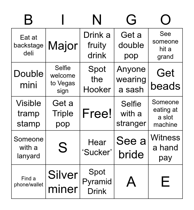 This bingo card has a free space and 53 words: V, E, G, A, S, Mini, Major, Minor, Double mini, Double minor, Selfie welcome to Vegas sign, Receive a hand pay, Witness a hand pay, See a bride, Witness a fight, Find a phone/wallet, Spot the Hooker, Selfie with a stranger, Seeing an influencer, See someone hit a grand, Get a Triple pop, Play a table game, Anyone wearing a sash, Eat at backstage deli, Eat a hotdog, Silver miner, Drugs/drug use, Barefoot woman carrying shoes, Eating at Eataly, Get beads, Pic of $500 win/ticket, Spot douchebag, Spot your college team apparel, Lend a light/smoke, Spot someone sleeping, Baby in a Casino, Get a double pop, Spot Pyramid Drink, Drink a fruity drink, Play a three reel game, Hotel architecture selfie, Play in high limit room, Someone eating at a slot machine, Buy a bonus, Place a sports bet, Hear ‘Sucker’, Someone wearing VM gear, Win your bet on Lucky Chance, Visible tramp stamp, Someone with a lanyard, Group shirts, Woo-girl wooing and Shutdown Ends.