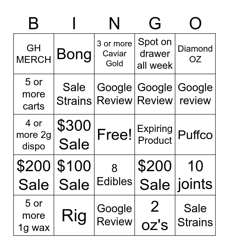 This bingo card has a free space and 24 words: $100 Sale, Rig, Google Review, 5 or more 1g wax, Diamond OZ, GH MERCH, 5 or more carts, Bong, Expiring Product, 8 Edibles, Google Review, 4 or more 2g dispo, $200 Sale, 10 joints, Sale Strains, 2 oz's, Puffco, 3 or more Caviar Gold, Google review, $300 Sale, Sale Strains, $200 Sale, Spot on drawer all week and Google Review.