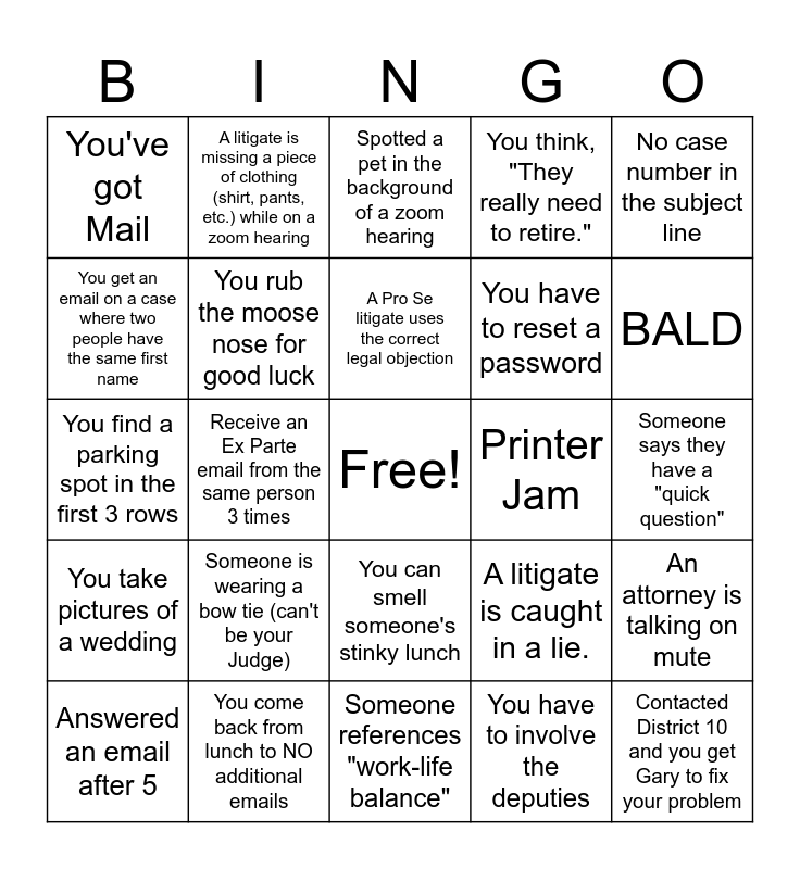 This bingo card has a free space and 24 words: Someone is wearing a bow tie (can't be your Judge), You come back from lunch to NO additional emails, A Pro Se litigate uses the correct legal objection, Answered an email after 5, No case number in the subject line, You've got Mail, You get an email on a case where two people have the same first name, A litigate is missing a piece of clothing (shirt, pants, etc.) while on a zoom hearing, Printer Jam, You can smell someone's stinky lunch, You have to reset a password, You find a parking spot in the first 3 rows, A litigate is caught in a lie., An attorney is talking on mute, You rub the moose nose for good luck, You have to involve the deputies, Someone says they have a "quick question", Spotted a pet in the background of a zoom hearing, BALD, Receive an Ex Parte email from the same person 3 times, Contacted District 10 and you get Gary to fix your problem, You take pictures of a wedding, You think, "They really need to retire." and Someone references "work-life balance".