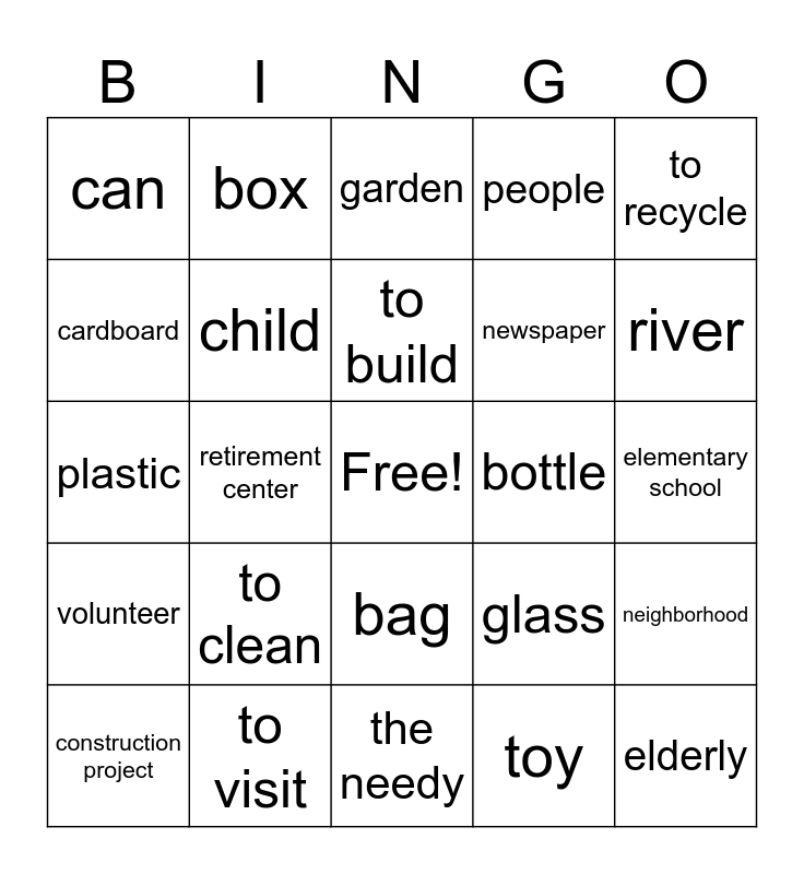 This bingo card has a free space and 24 words: to clean, to visit, to build, construction project, to recycle, can, cardboard, box, bottle, bag, newspaper, plastic, glass, neighborhood, child, toy, elementary school, garden, river, retirement center, elderly, volunteer, people and the needy.