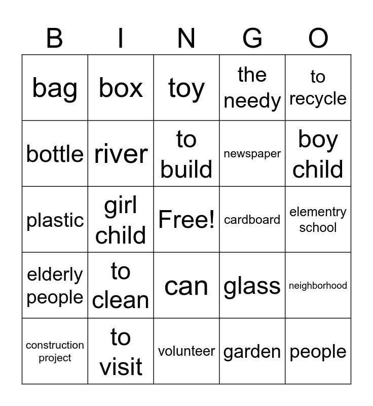 This bingo card has a free space and 24 words: to clean, to visit, to build, construction project, to recycle, bag, bottle, box, cardboard, can, newspaper, plastic, glass, neighborhood, river, garden, elementry school, toy, boy child, girl child, people, elderly people, the needy and volunteer.
