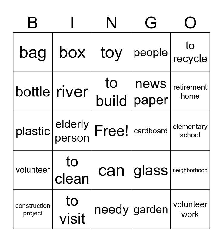 This bingo card has a free space and 24 words: to clean, to visit, to build, construction project, to recycle, bag, bottle, box, cardboard, can, news paper, plastic, glass, neighborhood, river, garden, elementary school, toy, retirement home, elderly person, volunteer work, volunteer, people and needy.