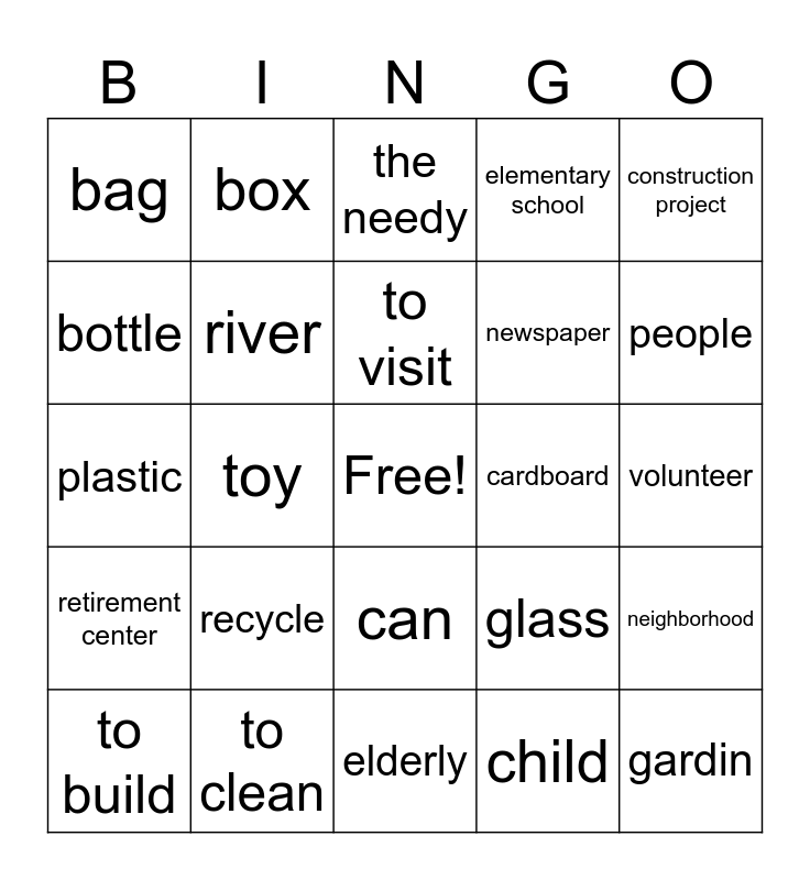 This bingo card has a free space and 24 words: recycle, to clean, to visit, to build, construction project, bag, bottle, box, cardboard, can, newspaper, plastic, glass, neighborhood, river, child, volunteer, the needy, people, toy, gardin, retirement center, elementary school and elderly.