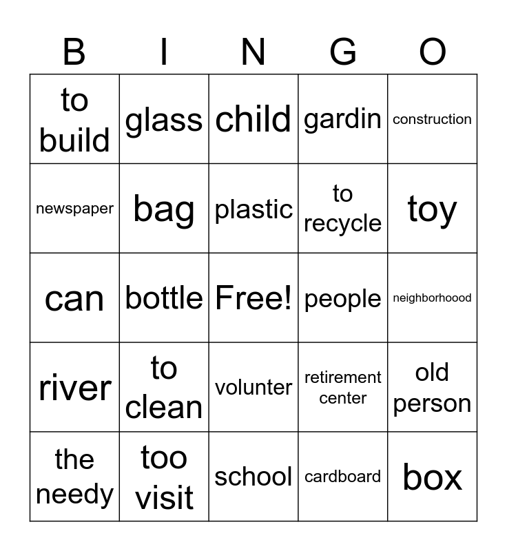 This bingo card has a free space and 24 words: to clean, too visit, plastic, the needy, construction, to build, newspaper, glass, people, volunter, to recycle, can, retirement center, old person, bag, cardboard, neighborhoood, child, toy, bottle, box, river, gardin and school.