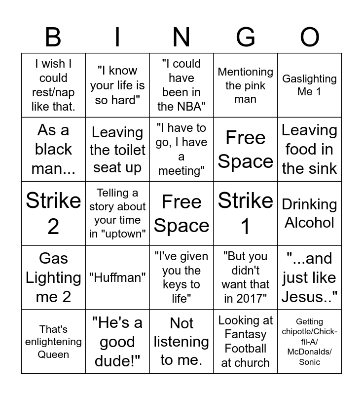 This bingo card has a free space and 24 words: "Huffman", "He's a good dude!", "I have to go, I have a meeting", That's enlightening Queen, Gaslighting Me 1, I wish I could rest/nap like that., As a black man..., "I know your life is so hard", Strike 1, "I've given you the keys to life", Free Space, Strike 2, "But you didn't want that in 2017", "...and just like Jesus..", Leaving the toilet seat up, Looking at Fantasy Football at church, Drinking Alcohol, "I could have been in the NBA", Leaving food in the sink, Telling a story about your time in "uptown", Getting chipotle/Chick-fil-A/ McDonalds/ Sonic, Gas Lighting me 2, Mentioning the pink man and Not listening to me..