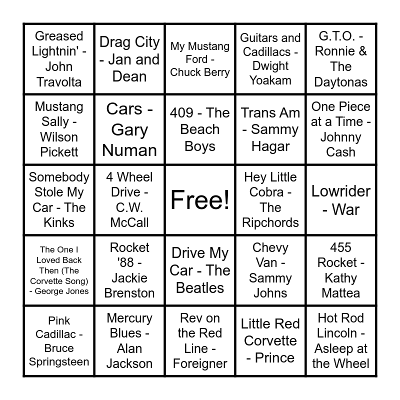This bingo card has a free space and 24 words: Rocket '88 - Jackie Brenston, Mercury Blues - Alan Jackson, 409 - The Beach Boys, Pink Cadillac - Bruce Springsteen, G.T.O. - Ronnie & The Daytonas, Greased Lightnin' - John Travolta, Mustang Sally - Wilson Pickett, Drag City - Jan and Dean, Hey Little Cobra - The Ripchords, Drive My Car - The Beatles, Trans Am - Sammy Hagar, Somebody Stole My Car - The Kinks, Chevy Van - Sammy Johns, 455 Rocket - Kathy Mattea, Cars - Gary Numan, Little Red Corvette - Prince, Lowrider - War, My Mustang Ford - Chuck Berry, One Piece at a Time - Johnny Cash, 4 Wheel Drive - C.W. McCall, Hot Rod Lincoln - Asleep at the Wheel, The One I Loved Back Then (The Corvette Song) - George Jones, Guitars and Cadillacs - Dwight Yoakam and Rev on the Red Line - Foreigner.