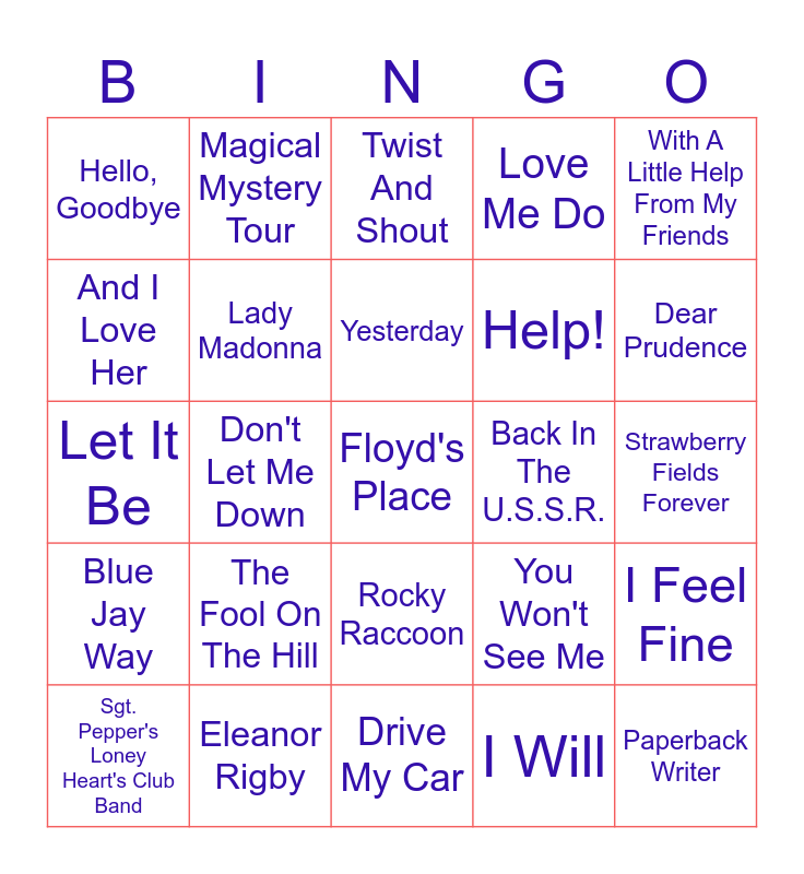 This bingo card has a free space and 74 words: Hey Jude, Come Together, Yesterday, Taxman, She Loves You, In My Life, Don't Bother Me, I Want To Hold Your Hand, Something, Day Tripper, Sgt. Pepper's Loney Heart's Club Band, A Hard Day's Night, Help!, With A Little Help From My Friends, Lucy In The Sky With Diamonds, Eleanor Rigby, Ticket To Ride, Back In The U.S.S.R., Penny Lane, Hello, Goodbye, Don't Let Me Down, Twist And Shout, Love Me Do, Strawberry Fields Forever, And I Love Her, Can't Buy Me Love, Get Back, Oh! Darling, A Day In The Life, I Am The Walrus, Lady Madonna, Norwegian Wood (This Bird Has Flown), All You Need Is Love, Getting Better, It Won't Be Long, Do You Want To Know A Secret, Nowhere Man, Please Please Me, Paperback Writer, I'm Happy Just To Dance With You, Things We Said Today, Rocky Raccoon, She's Leaving Home, And Your Bird Can Sing, Baby, You're A Rich Man, Magical Mystery Tour, Flying, Within You Without You, Octopus's Garden, Ob-La-Di, Ob-La-Da, Rain, If I Fell, You Won't See Me, What Goes On, All My Loving, I Saw Her Standing There, Drive My Car, Yellow Submarine, The Continuing Story Of Bungalow Bill, Blue Jay Way, The Fool On The Hill, Here Comes The Sun, I Will, I Feel Fine, Let It Be, Your Mother Should Know, I Should Have Known Better, Please Mister Postman, Dear Prudence, Hey Bulldog, Roll Over Beethoven, Money (That's What I Want), From Me To You and Got To Get You Into My Life.
