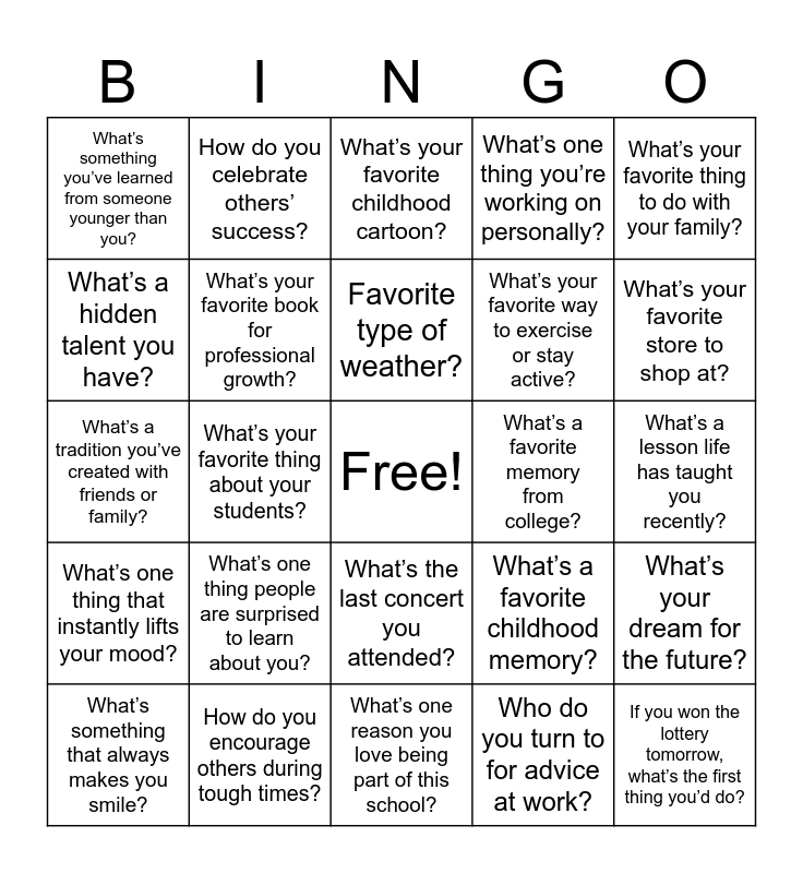 This bingo card has a free space and 240 words: Coffee, tea, or neither?, Sweet or salty snacks?, Beach vacation or mountain getaway?, Morning person or night owl?, What’s your favorite emoji?, What’s your favorite pizza topping?, Dogs or cats?, What’s your favorite color?, If you could be any animal for a day, what would you be?, What’s your dream car?, What’s your guilty pleasure TV show?, What’s your go-to karaoke song?, What’s your favorite holiday?, What’s a food you could eat every day and never get tired of?, What’s your least favorite food?, What’s your favorite season?, Favorite ice cream flavor?, What’s your favorite childhood cartoon?, If you could meet any celebrity, who would it be?, What’s your dream vacation destination?, What’s your favorite movie of all time?, What’s your go-to comfort movie?, What’s your favorite book or series?, What’s your favorite song right now?, What’s the last concert you attended?, If you could live anywhere in the world, where would it be?, What’s your hidden talent?, What’s one thing on your bucket list?, Who would play you in a movie about your life?, What’s your favorite board game or card game?, Pancakes or waffles?, Chocolate or vanilla?, Who’s your favorite cartoon character?, What’s your dream job if you weren’t a teacher?, If you could time travel, which era would you visit?, What’s your favorite app on your phone?, What’s the most used emoji in your texts?, Favorite thing to do on a lazy day?, What’s your ideal Friday night?, What’s a hobby you’d love to pick up?, If you won the lottery tomorrow, what’s the first thing you’d do?, What’s your go-to coffee order?, What’s your favorite store to shop at?, What’s your favorite thing to cook or bake?, What’s the weirdest food you’ve ever tried?, Favorite childhood game or toy?, What’s your dream home like?, Do you prefer books or movies?, What’s your favorite smell?, Favorite type of weather?, Do you sing in the car or shower?, Favorite breakfast food?, What’s the funniest trend you ever participated in?, What’s your dream concert lineup?, Who’s your favorite comedian?, If you could instantly learn another language, which would it be?, What’s your favorite candy?, Do you prefer Netflix, Hulu, or Disney+?, What’s your favorite weekend activity?, What’s your go-to dance move?, What’s a lesson life has taught you recently?, What’s your love language?, Who has shaped you the most in life?, What’s a fear you’ve overcome?, What motivates you every day?, What’s something that always makes you smile?, What’s your biggest pet peeve?, How do you recharge after a long week?, What’s one thing you’re working on personally?, What’s your proudest accomplishment?, Who in your life makes you laugh the most?, What’s a goal you’ve recently set for yourself?, How do you handle stress?, What’s a quote that inspires you?, What’s a piece of advice that’s stuck with you?, Who do you look up to?, How do you practice self-care?, What does happiness look like to you?, What’s your idea of success?, What’s something you’ve learned from failure?, What brings you peace?, What’s your dream for the future?, What’s something you’re grateful for today?, What’s one word that describes your current season of life?, What’s your biggest strength?, What’s your biggest challenge right now?, What’s your favorite childhood memory?, How do you want to be remembered?, What’s something that scares you but you want to try anyway?, How do you show kindness to others?, What’s one piece of advice you’d give your younger self?, Who always encourages you?, What’s your favorite way to spend time with family or friends?, What’s one thing that always calms you down?, What’s a personal mantra you live by?, How do you celebrate your own successes?, What’s one thing that instantly lifts your mood?, Who has been a mentor or role model in your life?, What do you love most about your personality?, What do you value most in friendships?, What’s something that makes you feel confident?, When do you feel most like yourself?, What’s something you’ve learned from someone younger than you?, What’s something you’ve learned from someone older than you?, What’s one tradition that means a lot to you?, Who would you want to switch lives with for a day?, What do you hope to achieve this year?, What’s something that makes you nostalgic?, What do you do to stay positive?, How do you handle change?, What are you most thankful for right now?, What’s something that gives you hope?, What’s one dream you haven’t given up on?, Who makes you feel seen and valued?, What’s your favorite memory from the past year?, How do you handle hard conversations?, What’s your favorite way to celebrate birthdays?, What’s a tradition you want to start?, What’s something you’ve recently discovered about yourself?, What’s something you’re looking forward to?, Who makes your workday brighter?, How do you like to be appreciated?, What’s something you admire about a colleague?, What’s a skill you’ve learned from another teacher?, What’s a compliment that’s stuck with you?, What kind of teammate are you?, What’s one way you help build staff morale?, Who would you want to co-teach with for a week?, What’s your favorite staff tradition or event?, How do you show gratitude to coworkers?, What’s something you love about your school community?, How do you encourage others during tough times?, What’s one thing that unites teachers everywhere?, What’s your favorite memory with a colleague?, Who do you turn to for advice at work?, How do you build trust with others?, What makes a team strong?, What’s one reason you love being part of this school?, How do you celebrate others’ success?, What’s one hope you have for your school community?, What’s something you’re passionate about outside of work?