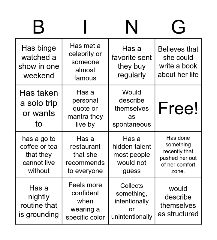 This bingo card has 17 words: Collects something, intentionally or unintentionally, Has a nightly routine that is grounding, Has a favorite sent they buy regularly, Has binge watched a show in one weekend, Has a restaurant that she recommends to everyone, Believes that she could write a book about her life, Has done something recently that pushed her out of her comfort zone., Would describe themselves as spontaneous, Free!, Has a personal quote or mantra they live by, Feels more confident when wearing a specific color, Has a hidden talent most people would not guess, Has taken a solo trip or wants to, Has met a celebrity or someone almost famous, has a go to coffee or tea that they cannot live without, Is the first to start dancing when music comes on and would describe themselves as structured.