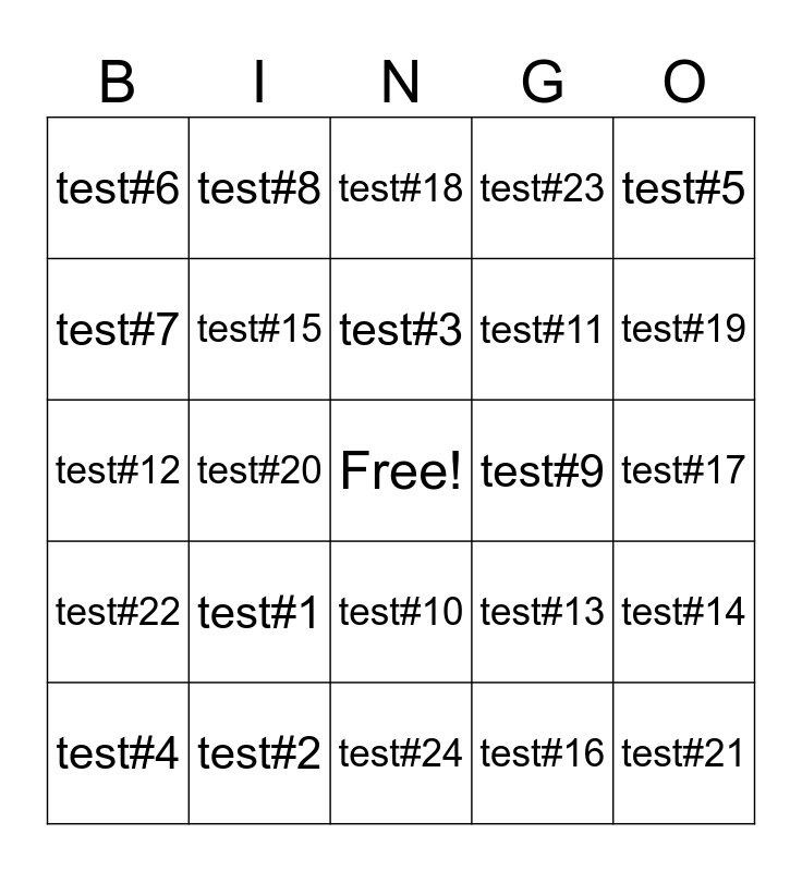This bingo card has a free space and 24 words: test#1, test#2, test#3, test#4, test#5, test#6, test#7, test#8, test#9, test#10, test#11, test#12, test#13, test#14, test#15, test#16, test#17, test#18, test#19, test#20, test#21, test#22, test#23 and test#24.