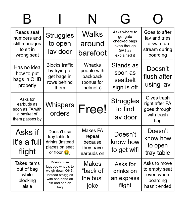 This bingo card has a free space and 24 words: Doesn’t use tray table for drinks (instead places on seat or floor 🤮), Doesn’t use luggage wheels to weigh down OHB. Instead struggles with one hand on bin and one on bag, Whacks people with backpack (bonus for helmets), Takes items out of bag while blocking aisle, Goes to after lav and tries to swim up stream during boarding, Reads seat numbers and still manages to sit in wrong seat, Has no idea how to put bags in OHB properly, Struggles to open lav door, Struggles to find lav door, Makes FA repeat because they have earbuds on, Stands as soon as seatbelt sign is off, Asks for earbuds as soon as FA with a basket of them passes by, Doesn’t know how to get wifi, Doesn’t know how to open tray table, Blocks traffic by trying to get bags in rows behind them, Asks for drinks on an express flight, Gives trash right after FA goes through with trash bag, Walks around barefoot, Doesn’t flush after using lav, Whispers orders, Asks to move to empty seat even when boarding hasn’t ended, Asks if it’s a full flight, Asks where to get gate checked bags even though GA has explained it and Makes “back of the bus” joke.