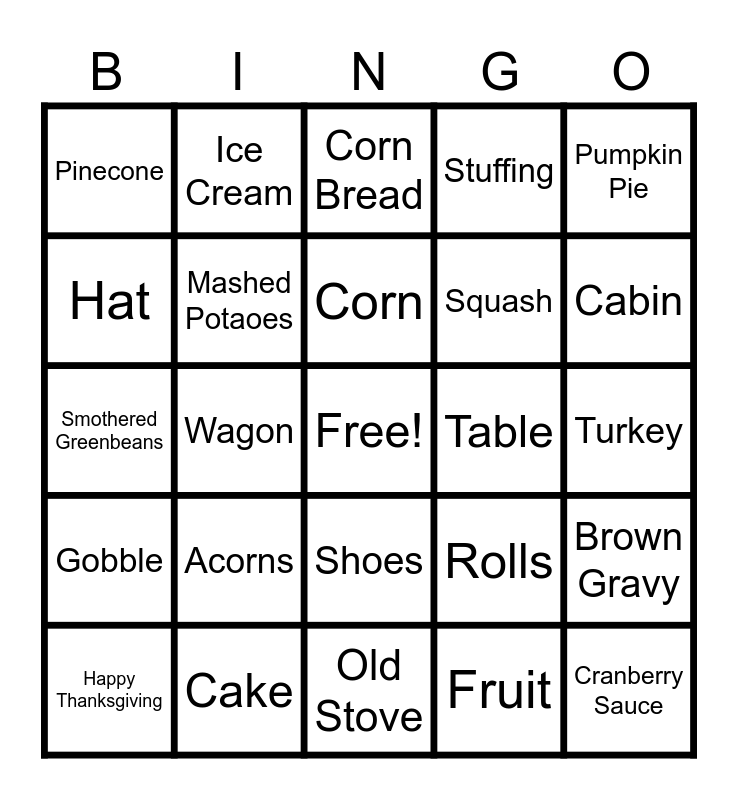 This bingo card has a free space and 39 words: Full, Apples, Sunflower, Mashed Potaoes, Happy Thanksgiving, Shoes, Corn, Bread, Pumpkin Pie, Gobble, Wagon, Stuffing, Cranberry Sauce, Turkey, Table, Acorns, Dinner, Pinecone, Wheat, Rolls, Hat, Old Stove, Squash, Cabin, Ham, Family, Friends, Cookies, Pecan, Ice Cream, Mac and Cheese, Orange, Corn Bread, Cake, Fruit, White Gravy, Brown Gravy, Smothered Greenbeans and Collard Greens.
