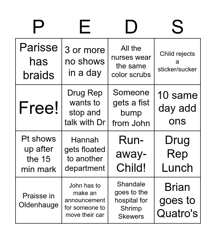 This bingo card has 16 words: John has to make an announcement for someone to move their car, Drug Rep Lunch, All the nurses wear the same color scrubs, Parisse has braids, Pt shows up after the 15 min mark, 3 or more no shows in a day, Run-away-Child!, Shandale goes to the hospital for Shrimp Skewers, Free!, Drug Rep wants to stop and talk with Dr, Praisse in Oldenhauge, Child rejects a sticker/sucker, Hannah gets floated to another department, 10 same day add ons, Someone gets a fist bump from John and Brian goes to Quatro's.