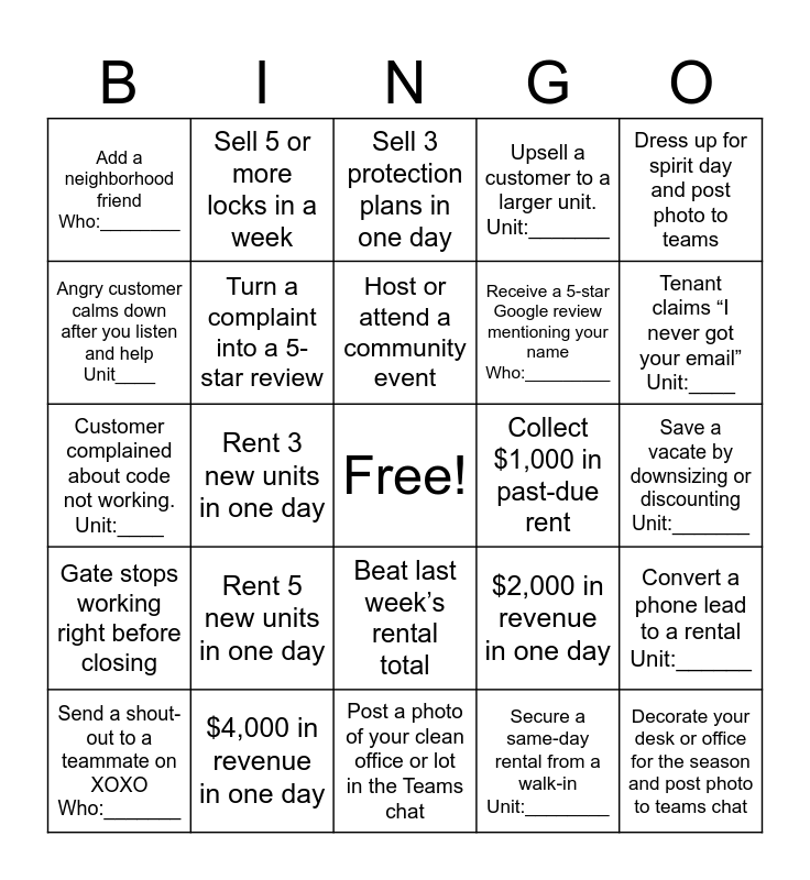 This bingo card has a free space and 24 words: Rent 5 new units in one day, $4,000 in revenue in one day, Host or attend a community event, Send a shout-out to a teammate on XOXO Who:_______, Dress up for spirit day and post photo to teams, Add a neighborhood friend Who:________, Angry customer calms down after you listen and help Unit____, Sell 5 or more locks in a week, Collect $1,000 in past-due rent, Beat last week’s rental total, Receive a 5-star Google review mentioning your name Who:_________, Customer complained about code not working. Unit:____, $2,000 in revenue in one day, Convert a phone lead to a rental Unit:______, Turn a complaint into a 5-star review, Secure a same-day rental from a walk-in Unit:________, Save a vacate by downsizing or discounting Unit:_______, Sell 3 protection plans in one day, Tenant claims “I never got your email” Unit:____, Rent 3 new units in one day, Decorate your desk or office for the season and post photo to teams chat, Gate stops working right before closing, Upsell a customer to a larger unit. Unit:_______ and Post a photo of your clean office or lot in the Teams chat.