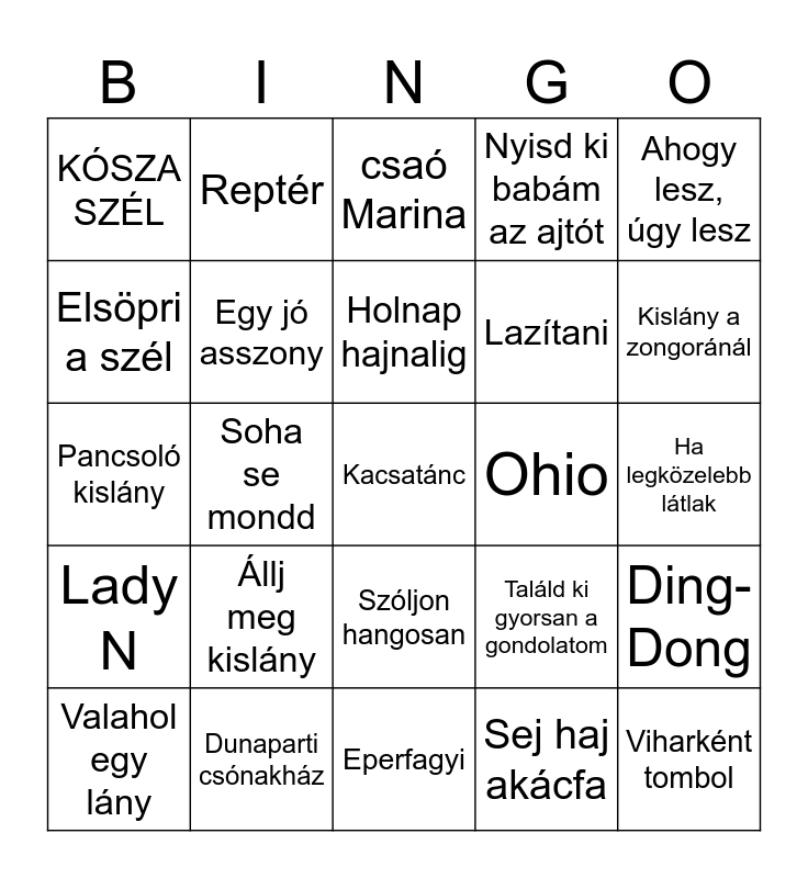 This bingo card has 25 words: Állj meg kislány, Eperfagyi, Holnap hajnalig, Valahol egy lány, Ahogy lesz, úgy lesz, KÓSZA SZÉL, Elsöpri a szél, Reptér, Ohio, Szóljon hangosan, Lazítani, Pancsoló kislány, Találd ki gyorsan a gondolatom, Ding-Dong, Egy jó asszony, Viharként tombol, Ha legközelebb látlak, csaó Marina, Kislány a zongoránál, Soha se mondd, Kacsatánc, Dunaparti csónakház, Lady N, Nyisd ki babám az ajtót and Sej haj akácfa.