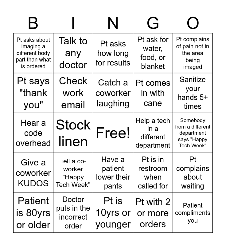 This bingo card has a free space and 29 words: Patient is 80yrs or older, Wipe down your workstation, Stock linen, Transfer patient via wheelchair, Pt asks about imaging a different body part than what is ordered, Pt asks how long for results, Check work email, Tell a co-worker "Happy Tech Week", Help a tech in a different department, Doctor puts in the incorrect order, Somebody from a different department says "Happy Tech Week", Patient compliments you, Pt is 10yrs or younger, Pt with 2 or more orders, Sanitize your hands 5+ times, Pt needs to take their bra off, Have a patient lower their pants, Give a coworker KUDOS, Pt complains of pain not in the area being imaged, Hear a code overhead, Pt is in restroom when called for, Pt jokes about anything, Pt comes in with cane, Pt says "thank you", Pt ask for water, food, or blanket, Talk to any doctor, Pt complains about waiting, Catch a coworker laughing and Restock the blanket warmer.