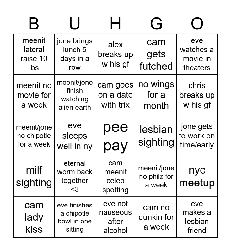 This bingo card has a free space and 24 words: eternal worm back together <3, eve finishes a chipotle bowl in one sitting, cam goes on a date with trix, cam lady kiss, eve watches a movie in theaters, meenit lateral raise 10 lbs, meenit no movie for a week, jone brings lunch 5 days in a row, lesbian sighting, cam meenit celeb spotting, no wings for a month, meenit/jone no chipotle for a week, meenit/jone no philz for a week, nyc meetup, meenit/jone finish watching alien earth, cam no dunkin for a week, jone gets to work on time/early, alex breaks up w his gf, chris breaks up w his gf, eve sleeps well in ny, eve makes a lesbian friend, milf sighting, cam gets futched and eve not nauseous after alcohol.